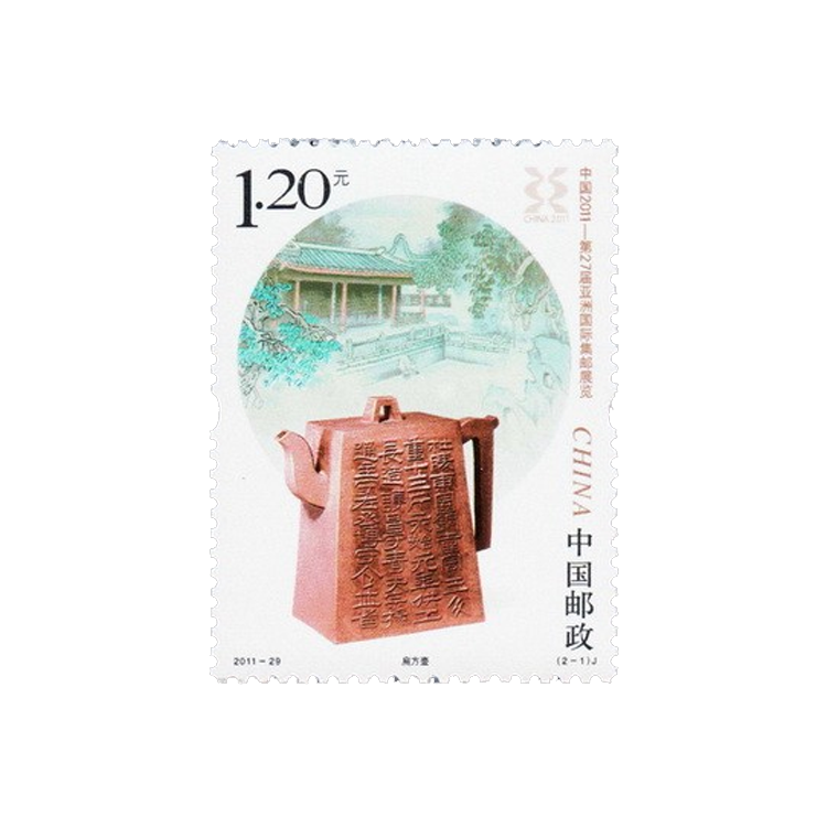 (2-1)邮票“扁方壶”的图案由两个元素组成,主图选用的是一件宜兴出产的紫砂方壶,背景图是无锡锡惠名胜区的“天下第二泉”。