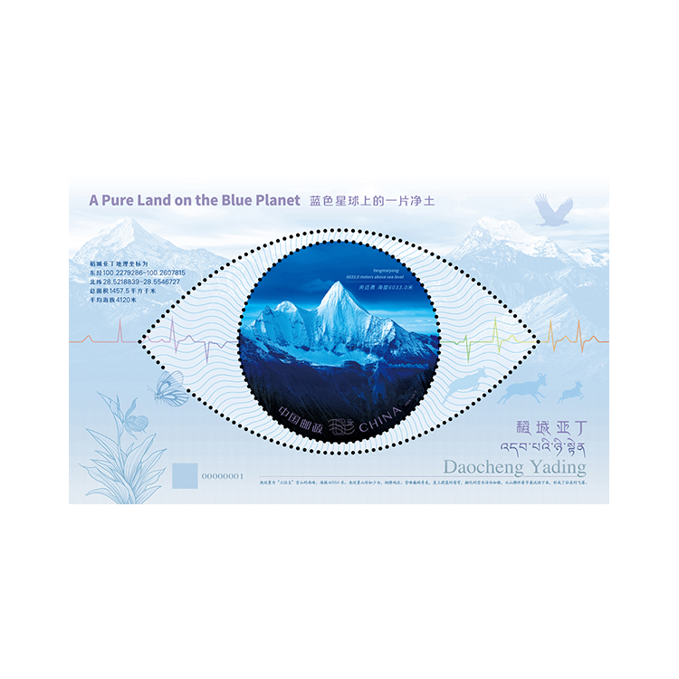 邮票画面采用四幅摄影作品,画面简洁、主题突出。第一枚“夏诺多吉”为“三怙主”雪山的东峰,海拔5951.3米。岩石为层状大理岩,强大的地质营力使岩层直立,异峰突起,角峰尖锐。雪峰之下为冰川裂解崩落形成的倒石堆,雪山脚下遍布高山灌丛和森林。该图通过特殊冷烫材料与定制胶印油墨的巧妙结合,展现了雪域高原“日照金山”的纯净与神圣。第二枚“洛绒牛场”海拔约4150米,是附近村民放牧的高山牧场。牧场被三座雪峰环绕,贡嘎河从草场穿梭,成群的牛羊在这里享受着充足的阳光,林间溪流潺潺,与牧场木屋交相辉映,构成一幅迷人的景色。该图巧妙选用动态光柱冷烫膜,贴合湖面颜色。第三枚“五色海”海拔约4600米,湖面呈圆形,面积0.7公顷,是稻城亚丁最高的湖泊。现代冰谷下伸至湖畔,湖底的植物和湖水会在阳光的照射下呈现出不同的光芒,渐变过渡却又有着微妙的变化,如一幅绚烂的重彩油画。冷烫效果将湖水的灵动、清透表现的淋漓尽致。第四枚“仙乃日”为“三怙主”雪山的北峰,海拔5998.5米。仙乃日是典型的向斜山,顶部呈近于水平状,两侧略微上翘,没有明显的尖锐角峰。山峰周围是冰蚀峰林地貌,冰川和冰川遗迹及高山湖泊环布其间。小型张“央迈勇”为“三怙主”雪山的南峰,海拔为6033.0米。央迈勇山形如少女,娴静端庄。雪峰巍峨奇美,直上蔚蓝的苍穹,融化的雪水洁白如银,从山腰伴着节奏流淌下来,形成了壮美的飞瀑。小型张以眼睛为主造型,瞳孔中看到了稻城亚丁雪山与湖泊的美景,背景则衬托了稻城三神山的全景图,边饰部分绘制了稻城的珍稀动植物。邮票第四枚与小型张采用“胶印+凹印+冷烫”的印刷方式,通过雕刻凹印温变技术向人们科普“温室效应”,当温度达到45℃以上时,邮票画面中的雪山会从雪白变为灰色,小型张画面中的雪山会从雪白变为蓝色,该工艺的设计是为倡议大家增加环保意识,警惕全球变暖危害,共同守护地球家园。
