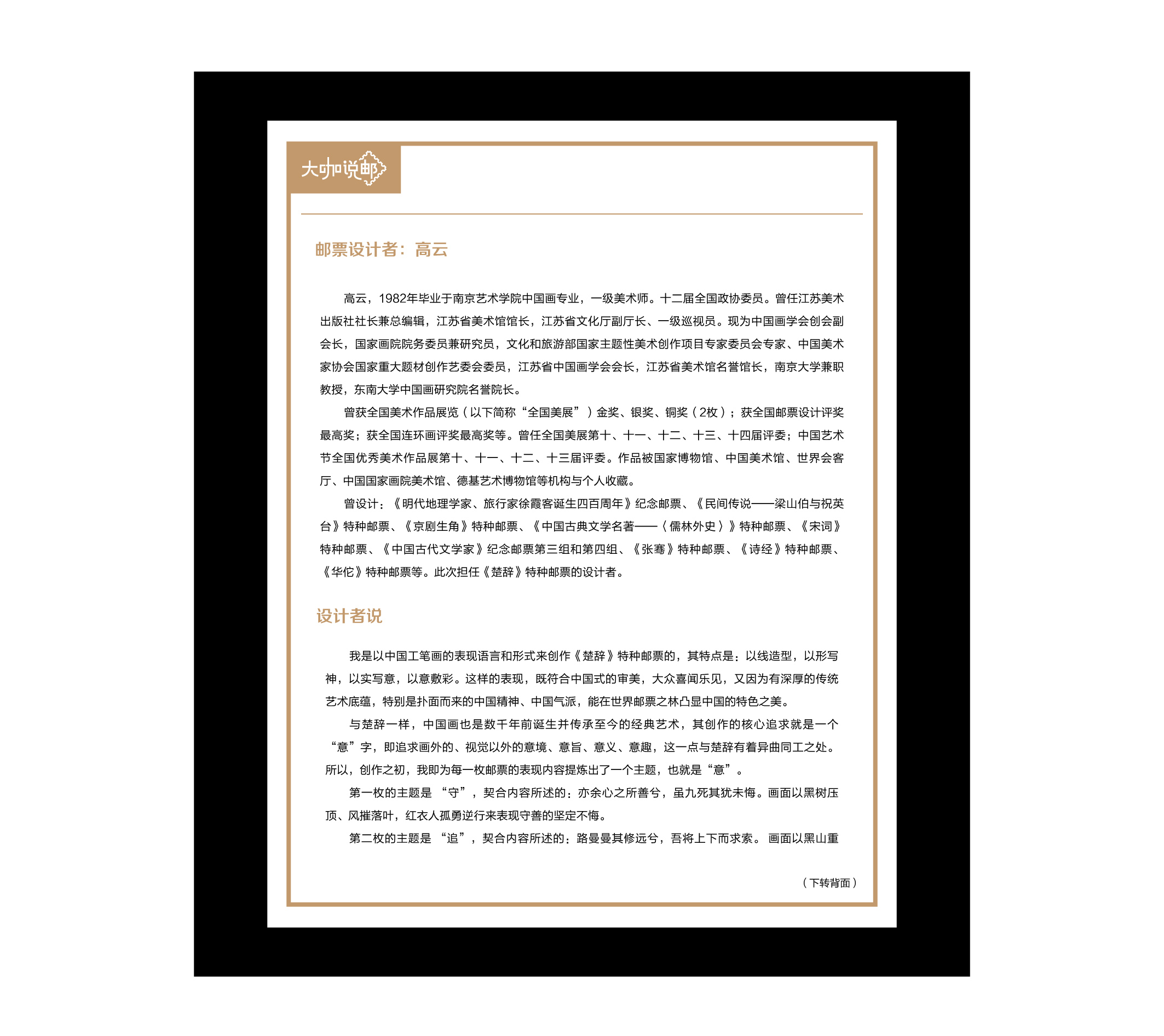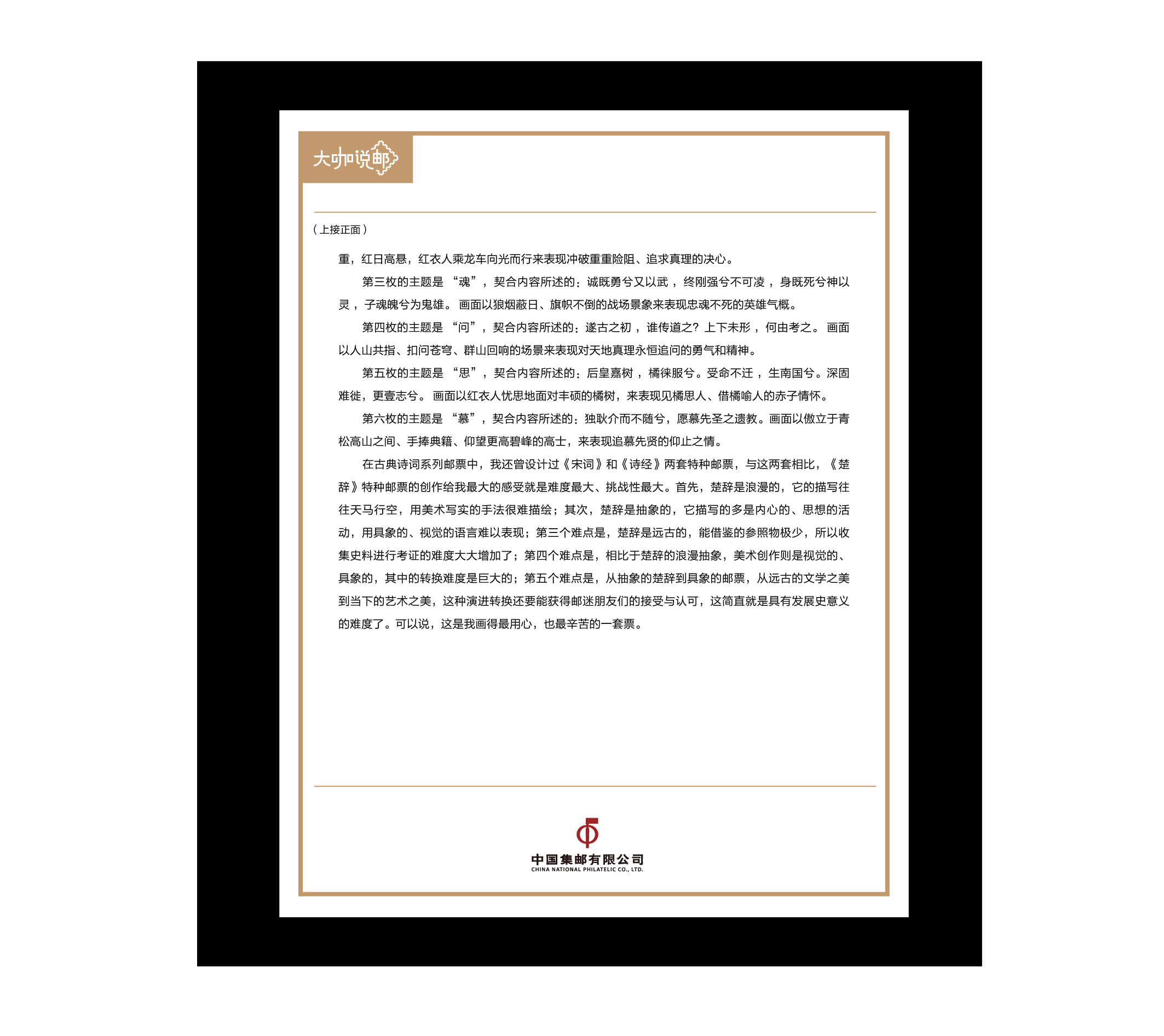 中国集邮有限公司于2025年6月30日发行《楚辞》整版票珍藏(大咖说邮系列)。