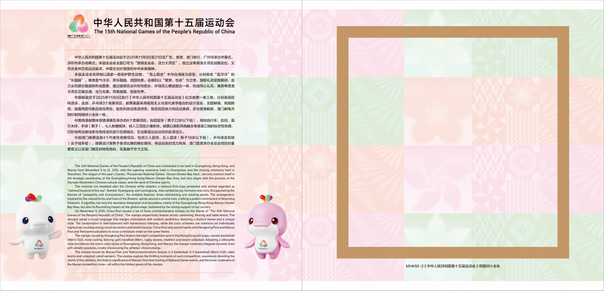 中国集邮有限公司于2025年11月9日发行《激情十五运 活力大湾区》中华人民共和国第十五届运动会纪念邮折。内插《中华人民共和国第十五届运动会》同题材小全张一枚。