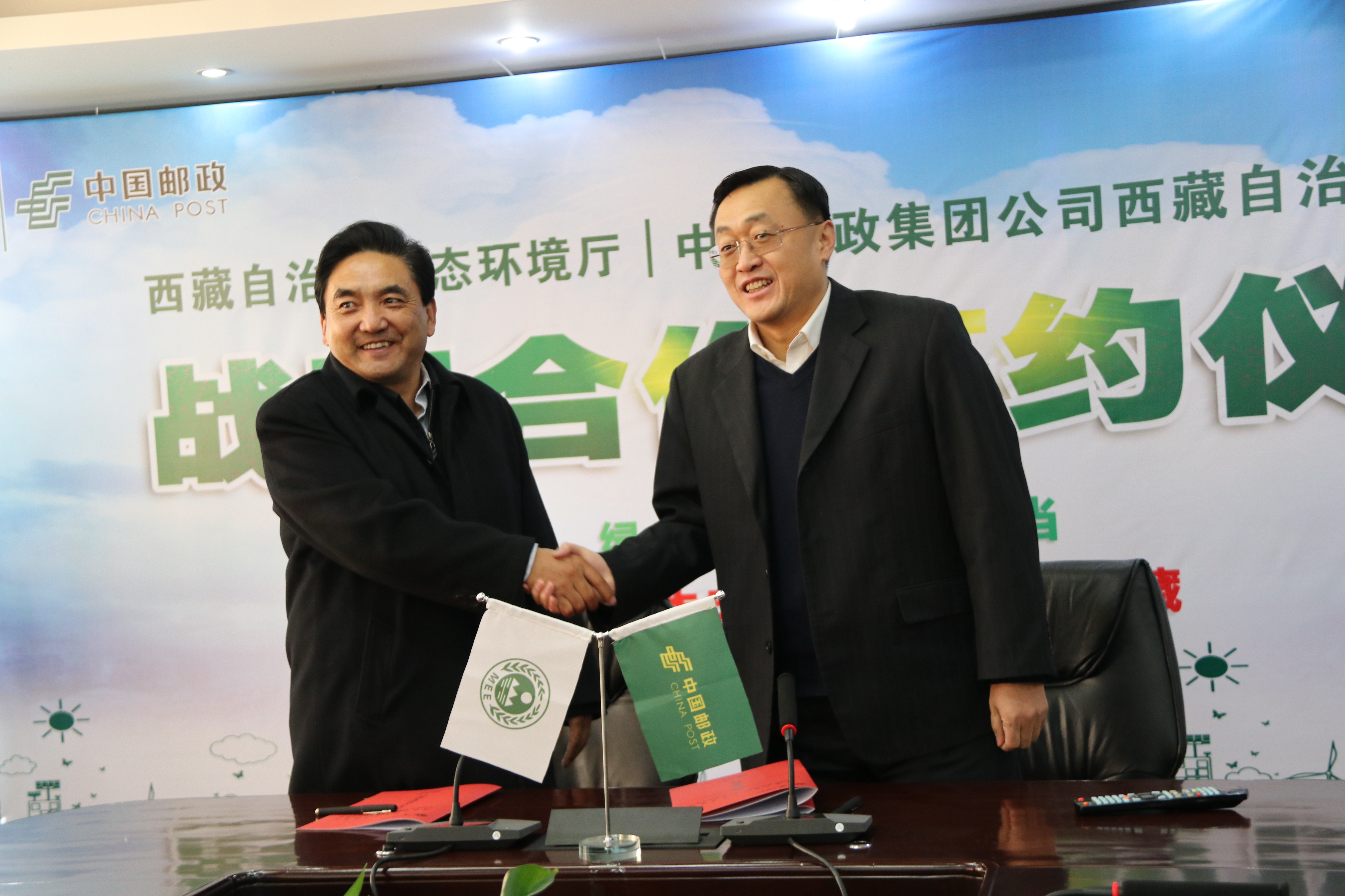 12月10日上午,根据党的十九大提出的“加快生态文明体制改革,建设美丽中国”新理念,为打好自治区污染防治攻坚战,中国邮政集团公司西藏自治区分公司与西藏自治区生态环境厅本着“资源共享、绿色发展、合作保护”的原则,在拉萨举行战略合作签约仪式。区生态环境厅厅长罗杰,西藏邮政分公司党组书记、总经理李柏平代表双方签约并作重要讲话,西藏邮政分公司副总经理布林主持会议。双方综合办公室、市场营销部、财务部和企业发展规划部等负责人参加会议。