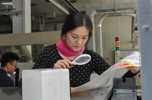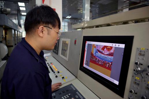 | Stamp designer Yuan Yishan is checking the printing of the stamps. |