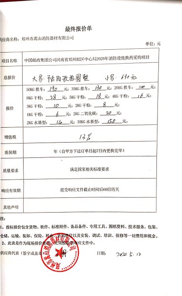 1.1项目名称:中国邮政集团有限公司河南省郑州邮区中心局2020年消防设施换药采购项目