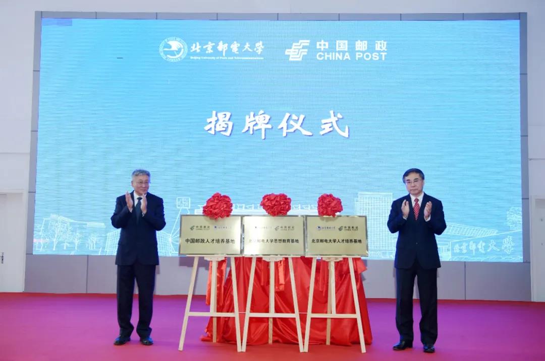 Chairman Liu Aili, Vice Presidents Kang Ning and Wen Shaoqi of China Post Group, Secretary of the Party Committee Wu Jianwei, President Qiao Jianyong, Vice Presidents Zhao Jining and Wang Wenbo of BUPT attended the ceremony. Liu Aili and Qiao Jianyong delivered a speech respectively. Kang Ning and Wang Wenbo signed the agreement on behalf of both sides. Liu Aili and Wu Jianwei jointly unveiled “China Post Talent Cultivation Base”, “BUPT Talent Cultivation Base”, and “BUPT Ideological Education Base”.