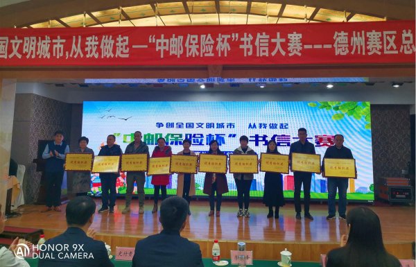 11月28日,德州市邮政分公司举办的以“争创全国文明城市,从我做起” 为主题的“中邮保险杯”书信大赛圆满收关。此次活动历时3个月,在团市委和市教育局等部门支持下,取得了良好的效果,在全市中小学掀起了“书信热潮”,树立邮政良好的品牌形象,为今后政邮深入合作奠定了基础。