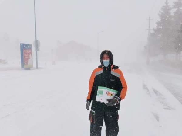 投递员王燊怕大雪把邮件打湿