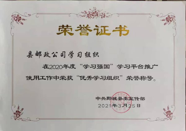 3月25日,鄄城县邮政分公司被县委宣传部授予“学习强国”学习平台“优秀学习组织”荣誉称号,该分公司员工刘璐璐同志被评为“学习标兵”。