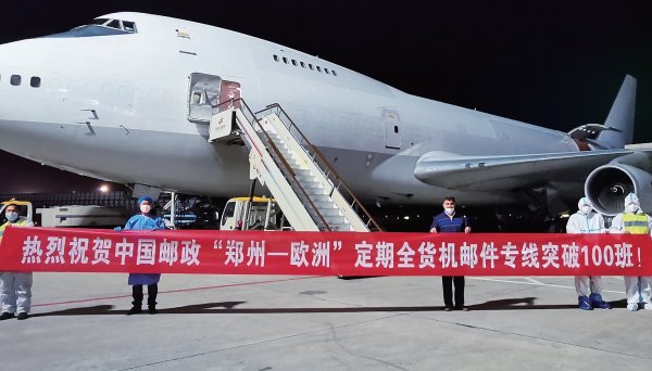 At 2 a.m. on April 5, a plane carrying 9.5 tons of mail and 54 tons of cargoes took off from Frankfurt, Germany, and landed at the Zhengzhou Xinzheng International Airport, marking the China Post’s all-cargo air route from Zhengzhou to Europe with a breakthrough of 100 regular flights. Since the opening of this air route on June 23 of last year, the transportation time of international mail from Henan Province to Europe has been reduced to four to six days. Most of the outbound international mails from Beijing, Shanghai, Guangzhou and Shenzhen destined for 14 European countries have been transferred to Zhengzhou and dispatched abroad via this air route. Meanwhile, the charter flight will carry cargoes and international mail coming from Europe on its way back.