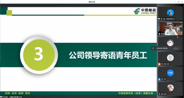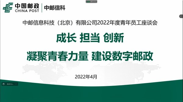 为深入了解青年员工思想动态,倾听青年员工诉求,积极解决青年员工工作、生活中的实际困难,引导青年员工更好地融入企业发展,指导其成长成才,4月28日下午,中邮信息科技(北京)有限公司组织召开以“成长 担当 创新——凝聚青春力量 建设数字邮政”为主题的青年员工座谈会。公司党委委员以及青年员工代表出席会议,公司党建工作部及各级团干部列席会议。