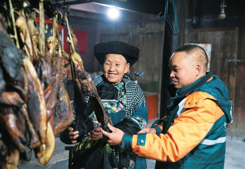 A rural postman of Shibadong Post Office is helping a villager sell the cured meat to the outside world. |