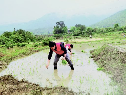 Resident work team members of Jiangxi Postal Branch are transplanting rice seedlings in the field. |