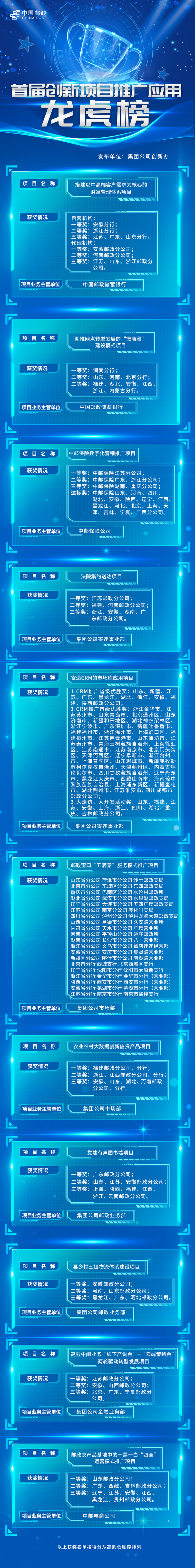 In order to better promote and apply the outstanding innovation projects and get their achievements transferred to serve the operation and development of enterprises, China Post Group Corporation Limited launched the nationwide promotion and application of the first 11 key innovation projects, covering major business sectors such as postal service, parcel, express and logistics business and financial service. These projects were promoted to postal branches in 31 provinces (autonomous regions, municipalities), 36 branches of the Postal Savings Bank of China, and 21 branches of China Post Life Insurance Co Ltd. During the promotion period, they have yielded excellent results.