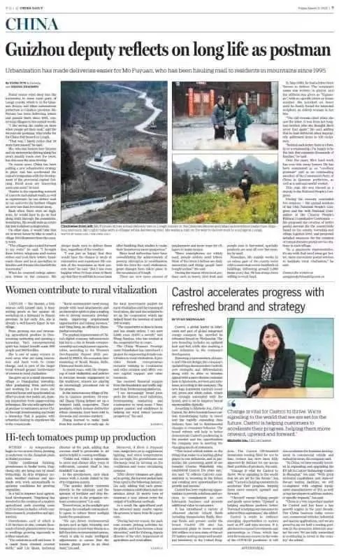 On March 31, China Daily published a headline story entitled "Guizhou deputy reflects on long life as postman".