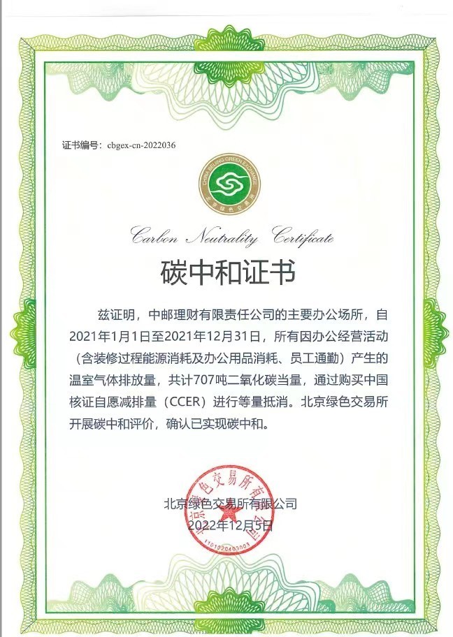 The carbon neutrality certificate requires organizations to promote green transformation comprehensively and deeply in daily operations, investment structure and other aspects. In terms of daily operations, PSBC Wealth Management attaches much importance to eco-friendly offices, and has carried out emission reduction actions across the company. In 2022, it started the action of operational carbon neutrality. After carbon emission accounting and verification by professional institutions, it purchased equal amount of CCER (China Certified Emission Reduction) cancellation to offset the emissions, and thereby obtained the carbon neutrality certificate issued by CBGEX. In terms of investment structure, PSBC Wealth Management has also increased its support for green industries such as new energy, ecological and environmental protection, and low-carbon transformation, providing them with diverse financial support through bonds, equity, non-standard investments and other investment methods. At the same time, it has made a series of innovations in review and approval, ESG (Environmental, Social and Governance) methodology, and product system.