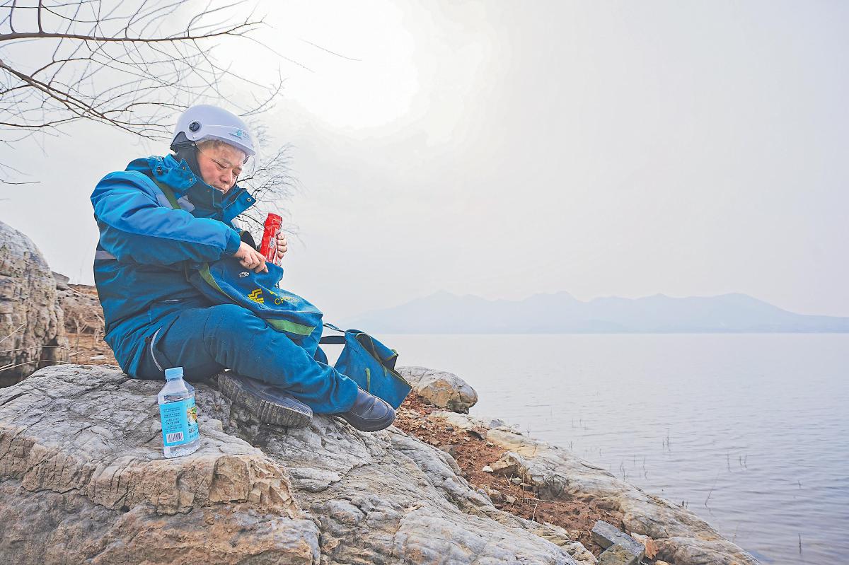 在等待渡船时,石新国吃点干粮、喝点水。 李平 摄