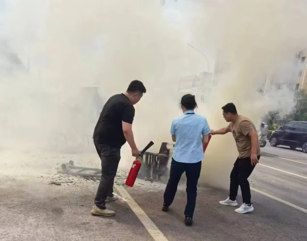 现场火势发展迅猛,热浪逼人,张烨第一个冲上前去,打开灭火器,白色的粉末喷涌而出。“注意安全,不要靠得太近!”张烨一边灭火,一边对着身后的同事们大声提醒。张梦璐、金晓丽和刘玉柱将灭火器对准着火点,试图将火势控制在最小范围内。