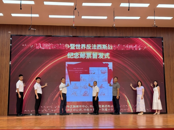 在抗战胜利80周年这个具有特殊历史意义的日子,《中国人民抗日战争暨世界反法西斯战争胜利八十周年》纪念邮票首发仪式在中南大学第一附属小学举行。