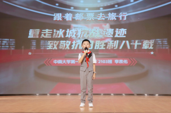 首发式上,麓枫少年邮局的同学们带来“跟着邮票去旅行”主题分享。李泉佑同学讲述了参观哈尔滨东北烈士纪念馆、侵华日军第七三一部队遗址的经历,生动的描述让听众仿佛置身历史现场。汪希言同学则分享了参观芷江受降纪念馆的见闻,带领大家重温“八年烽火起芦沟,一纸降书落芷江”的历史性时刻。孩子们声情并茂的讲述,不仅展现出对历史的深刻理解,更传递出新时代少年的责任与担当。