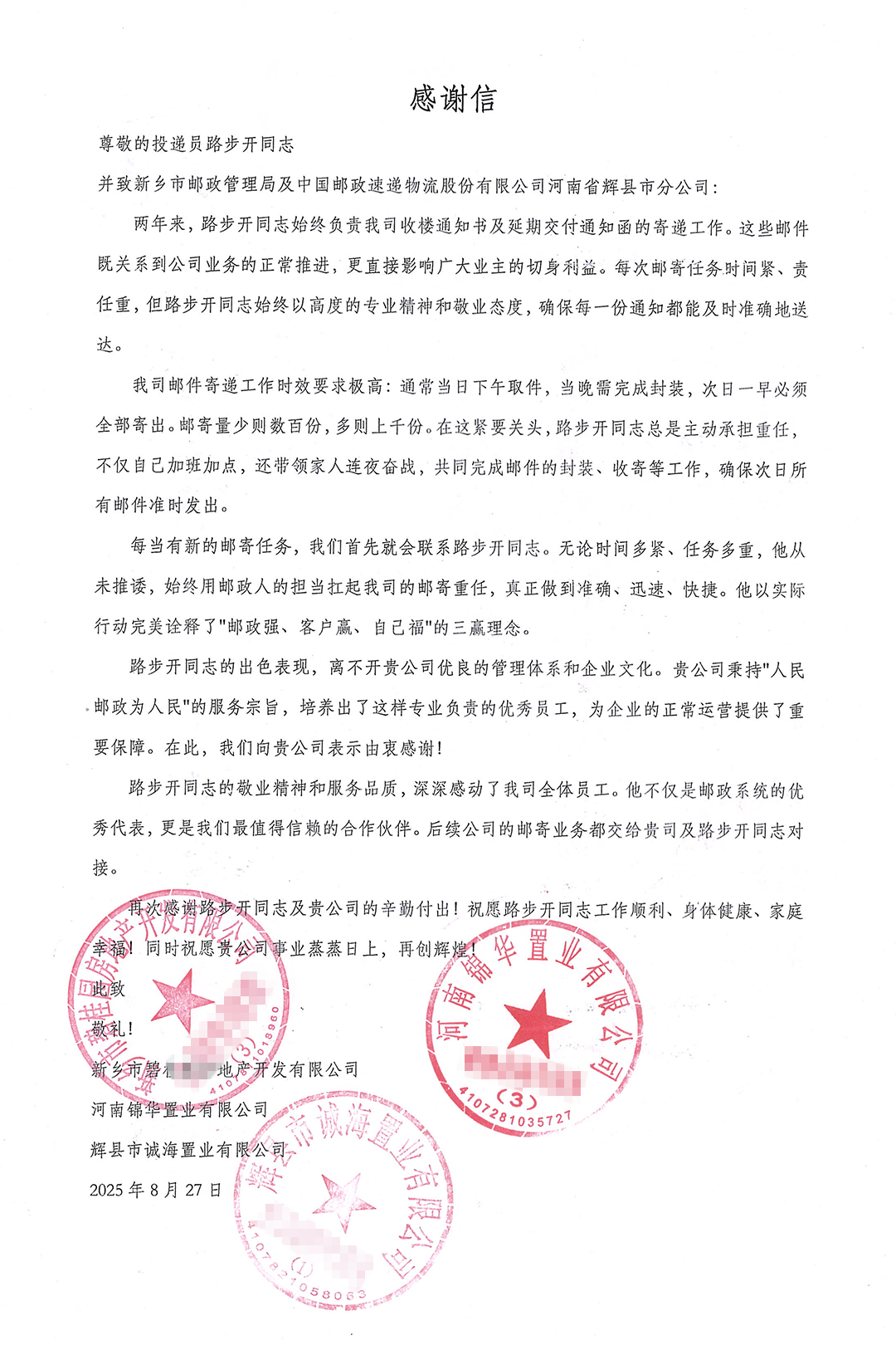 发来感谢信的三家房产企业均属碧盈房产及旗下子公司。在服务辉县碧盈房产的两年中,路步开始终坚守岗位,彰显了邮政揽投员的专业与担当。路步开主要负责该企业收楼通知书、延期交付通知函等重要文件的寄递工作。此类邮件不仅关系到房产企业业务的顺利推进,更直接牵动着众多业主的切身利益,往往面临时间紧、任务重、数量大的挑战。