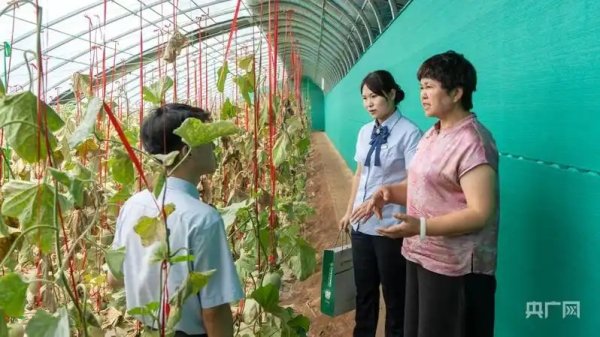 邮储银行武山县支行客户经理查看新式冬暖大棚种植情况(央广网发 邮储银行甘肃省分行供图)