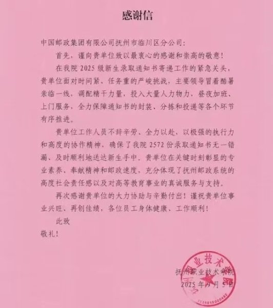 近日,临川区分公司收到一封温暖的感谢信,抚州职业技术学院对邮政提供的优质揽收服务表示高度赞赏,指出“贵单位在关键时刻彰显专业素养、奉献精神和邮政速度,充分体现了抚州邮政系统的高度社会责任感以及对高等教育事业的真诚服务与支持。”