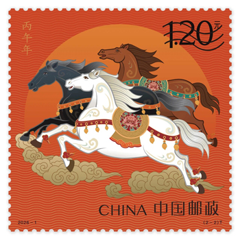 《丙午年》特种邮票由王红卫、赵恩重设计。邮票第一枚图名为“驰跃宏图”,以“腾跃新时代”为核心意象,展现了一匹红马奔驰于祥云之上,鬃毛如焰,四蹄生风。第二枚图名为“万骏臻福”,以“万马奔腾,驰骋千里”为核心意象,展现了三匹奔跑的骏马。三为众,寓意奔腾不息、共同奋进。图案背景及马身辅以祥云纹、火焰纹、缠枝纹等传统吉祥纹样,既隐喻福运连绵,亦强化东方美学底蕴。邮票中的骏马既展现出“一马当先”的开拓气概,也诠释了“万马奔腾”的团结力量,将马的形象与新时代中国人民奋发进取的精神风貌完美融合于方寸之间。