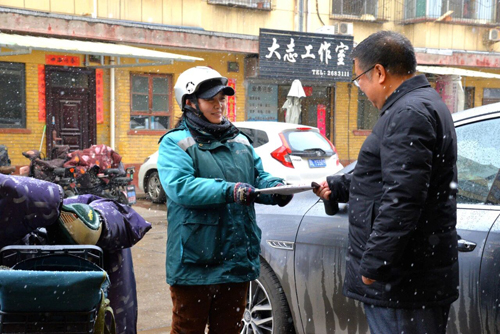 太原市迎泽区新生里揽投部投递员冒雪出班。王蕴伟 摄