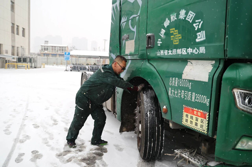 昔阳县揽投部人员对邮运车辆进行全面检查,确保雪天行车安全。 赵晓莉 摄