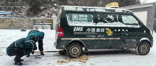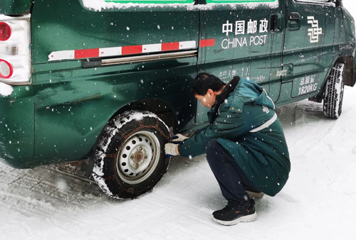 为确保行车安全,吕梁市投递员出班前为邮车安装防滑链。李潇 李华 摄