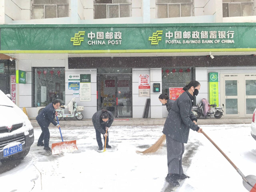 榆社县河南街邮政营业所员工以雪为令,及时清扫网点门前的积雪。张宇婷摄
