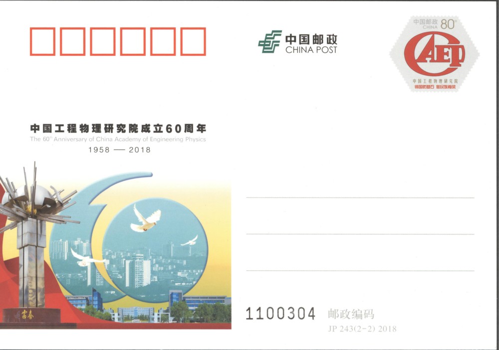 China Post issued a set of two commemorative stamped postcards featuring the 60th Anniversary of the Founding of the China Academy of Engineering Physics (CAEP) with a denomination of 0.8 yuan (0.1152 U.S. dollars) on October 16, 2018. 2018 marks the 60th Anniversary of the founding of the CAEP. The academy is the only nuclear weapon research and production unit in China listed separately in the national scientific research program. It is a comprehensive research institute that focuses on the development of advanced science and technology in national defense, and integrates theory, experiment, design and production in this aspect. Its research areas include physics, mechanics and mathematics, chemistry and materials, information science and electronic engineering. Over the past 60 years, the academy has persisted in promoting the sustainable development of advanced weapons as well as science and technology in national defense, ensuring that China’s strategic deterrent forces are always safe, reliable and effective. It has made great contributions to the cause of national defense and the development of science and technology in China.
