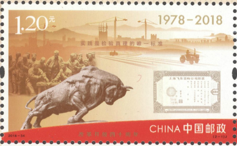 The “Holding the Banner Highly” stamp mainly features the Shenzhen reclamation cow sculpture, the stock ticket sample of Shanghai Feilo Acoustics. Co. Ltd (SH: 600651), and the “Big Contracting” sculpture of Xiaogang Village in the central province of Anhui. The words on the stamp are “Practice is the only criterion for testing the truth.” It implies that the Party Central Committee leads the people of all ethnic groups to forge ahead and find a road of socialism with Chinese characteristics.