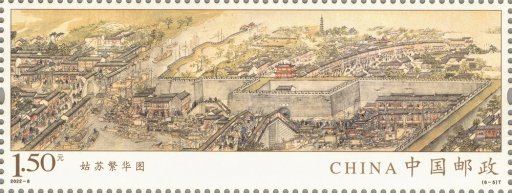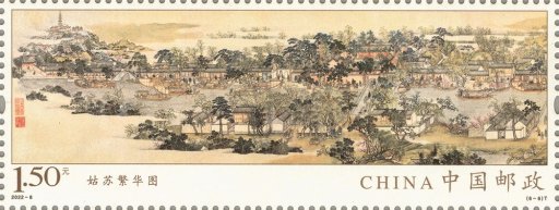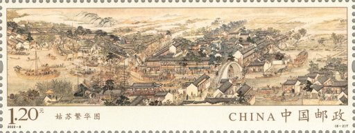 China Post is to issue a set of six special stamps entitled Prosperous Suzhou on May 18, 2022. The denomination of the stamps is 7.40 yuan, and 7.3 million sets of such stamps are planned to be issued. In addition, 200,000 copies of long scroll stamp folders will be issued. The painting Prosperous Suzhou, ink and color on paper, 1,241 cm in length and 36.5 cm in width, is currently housed in the Liaoning Provincial Museum. The painting was completed in 1759 during the reign of Emperor Qianlong (1735-1796). Painted in hand scroll format with cavalier perspective painting methods, the entire piece vividly illustrates the urban life of Suzhou during the High Qing era, with thriving businesses, countless merchants and various goods. It is hailed as another magnificent long scroll in the history of traditional Chinese painting after Along the River During the Qingming Festival painted in the Song Dynasty. The whole scroll depicts meticulously the local conditions and customs in the southern regions of the Yangtze River, including the landscape of lakes and hills, cottages and gardens, city wall and its gates, ancient ferries and rowing boats, towns along the river, houses by the water, folk customs, government offices and shops of all trades, all of which reflect vividly the prosperity of Suzhou in the mid-18th century with picturesque scenery, abundant resources, trades flourishing and talents gathering. Therefore, it holds extremely high historical and artistic value.