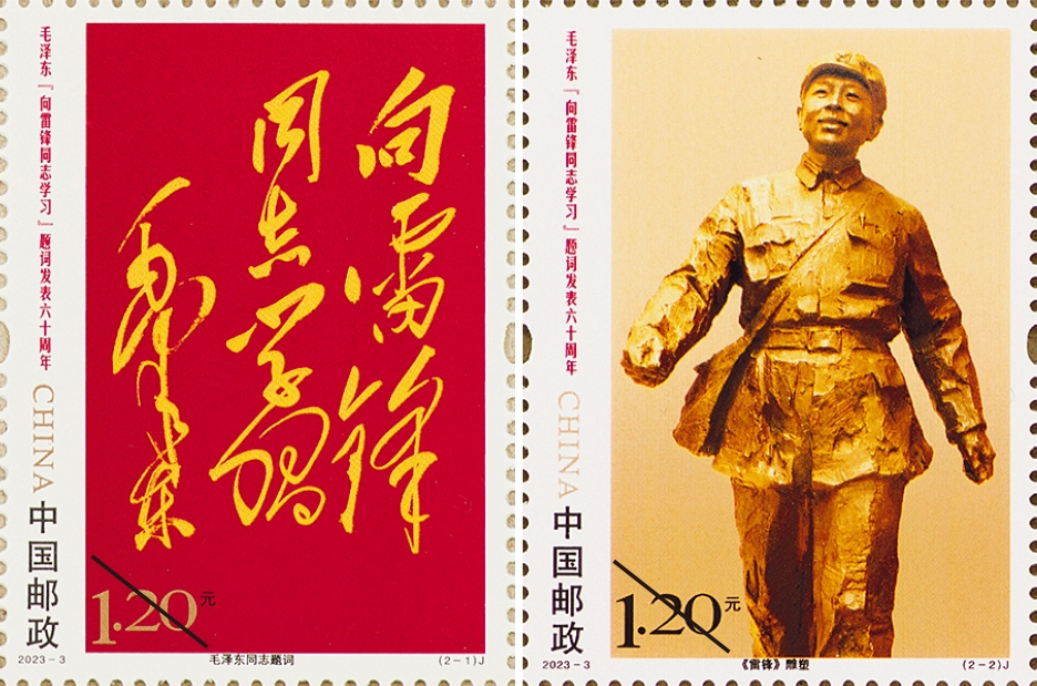 China Post is to issue a set of two commemorative stamps entitled The 60th Anniversary of the Publication of Mao Zedong’s Inscription “Learn from Comrade Lei Feng” on March 5, 2023. The designs are named respectively Comrade Mao Zedong's Inscription and “Lei Feng” Statue. The denomination of the whole set is 2.40 yuan, and the planned circulation is 7.5 million sets. Lei Feng, a late Communist soldier and a role model of serving the people wholeheartedly, was born in Hunan province on December 18, 1940. Throughout his lifetime, he studied hard, and worked selflessly for the public interest. In addition to completing his own work, he often helped others, and fulfilled his promise of "devoting the limited life into limitless service for the people". Lei Feng died in the line of duty on August 15, 1962. On March 5, 1963, the People's Daily published Mao Zedong's inscription, calling on the whole country to learn from comrade Lei Feng. Since then, activities of learning from Lei Feng have widely spread throughout China. This year marks the 60th anniversary since revolutionaries of the older generation, including Mao Zedong, wrote inscriptions for comrade Lei Feng.
