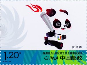 China Post is to issue a set of two commemorative stamps entitled The 31st FISU Summer World University Games Chengdu 2021 on July 28, 2023. The two stamp designs are respectively named The Emblem and The Mascot. The denomination of the whole set is 2.40 yuan. The planned circulation is 6,795,000 sets. College students are the most active and vital force in society, and the dream chasers of the times. Every college student has a dream in his or her heart. The FISU World University Games is a grand event for college students around the world to compete and communicate, and also a stage for them to pursue their dreams. The 31st Summer Universiade will be held in Chengdu, Sichuan province from July 28 to August 8, 2023. It will witness global student-athletes challenging their limits and realizing their dreams. The main design of the emblem is based on the letter “U” from the English word “university”, with a combination of two typical Chinese elements — the Sun and Immortal Birds and Phoenix. The “U” is divided into four gradient color blocks of vermilion, bright yellow, emerald green, and lake blue, echoing the International University Sports Federation (FISU) logo. The mascot is a giant panda named “Rongbao”, who is in a running posture, holding the torch with flames shaped like “31”. The ears, eyes and tail of Rongbao also resemble the shape of flames.
