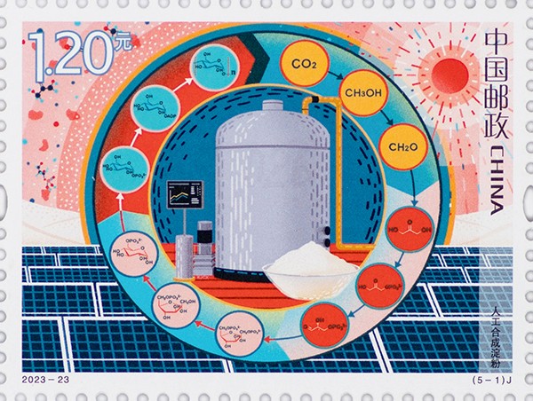 China Post is to issue a set of five commemorative stamps entitled Innovations in Science and Technology (Series 4) on November 1, 2023, the designs of which feature the synthetic starch, the perennial rice, the Mars rover Zhurong, the Advanced Space-based Solar Observatory Kuafu-1 and the Large High Altitude Air Shower Observatory (LHAASO). The denomination of the whole set is 6.6 yuan, and 7 million sets are planned to be issued. Researchers of Tianjin Institute of Industrial Biotechnology of Chinese Academy of Sciences have made a significant breakthrough in the starch synthesis, a de novo route for artificial synthesis of starch from carbon dioxide without plant photosynthesis for the first time in the world. Perennial rice is an innovation in rice breeding. Without reseeding, this new rice variety can be harvested twice a year or for several years after overwintering, which can greatly reduce labor input, maintain relatively stable yields, and achieve light and simplified rice production. The Mars rover Zhurong is the world’s first Mars rover with an active suspension system. It can not only withstand the complex environment of Mars, but also conduct scientific exploration, thus deepening people’s knowledge of key scientific issues such as the evolution of Mars and its water/ice distribution. Kuafu-1 is an advanced solar exploration satellite independently proposed by Chinese solar physicists. It has achieved a leapfrog breakthrough in the space-based solar exploration satellite and opened up a new era of comprehensive space-based solar observation. The Large High Altitude Air Shower Observatory (LHAASO), also independently proposed, designed and constructed by Chinese scientists, is the new generation gamma ray telescopes and cosmic ray detectors with the unprecedented sensitivity. LHAASO is dedicated to decoding the origin of cosmic rays and hence more mysteries of the universe.