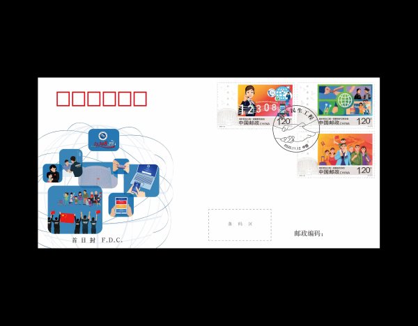 首日封一套一枚,盖销首日戳。设计采用插画手法,分别体现邮票中领事便民服务、领事保护日常协助、祖国在你身后等内容。首日戳设计为两只紧紧握住的手,体现协助与热情的含义。