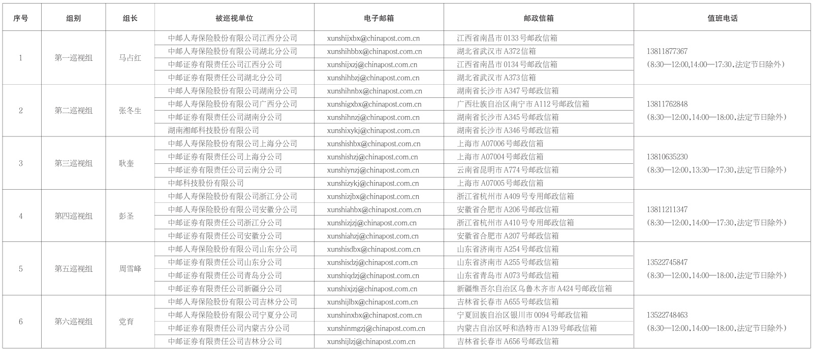 中国邮政集团有限公司党组2025年第二批巡视进驻信息一览表