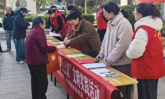 身穿红马甲的邮政志愿者逐户向居民发放文明创建宣传资料,倡导“说文明话、办文明事、做文明人”,号召大家主动参与志愿服务,维护社区环境。通过填写纸质问卷,认真记录居民群众对老旧小区环境整治、公共设施完善等方面的意见建议。对老年居民等特殊群体,志愿者们逐题宣读、现场代填,活动现场十分暖心。