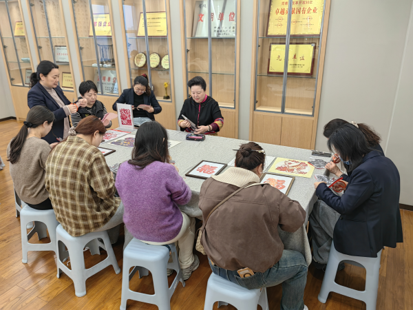 活动现场暖意融融,点茶的余香与咖啡的醇香在这一刻碰撞,伴随着欢声笑语大家围坐在一起,认真聆听非遗老师的讲解,沉浸式体验手工的独特魅力。世界非遗项目传统宋锦的展示,从每一位女同胞们指尖划过的是从缫丝、染色到成锦20多道工序,来自一千多年前宋朝的顶级工艺,大家用这色调雅致细腻的布料静心创作,用心感受着中华传统文化的博大与精深;来自剪纸艺术世家,郑州市非物质文化遗产剪纸代表性传承人杨征老师一把剪刀,一张红纸,便把中国人最朴素的浪漫与匠心跃然纸上。这源于民间,长于烟火的千年传承,以最简约的形式,用平凡的纸张,绽放出永不褪色的东方大美;河南省民间文艺家协会会员李茜老师,作为非遗传承人,潜心植物色染,同女同胞们一起现场制作,一扎一染,一蓝一白,大家在松开绳结的那一刻,蓝白交织,晕痕朦胧,每一道纹路都是独一无二的惊喜。蓝是天青,白是云影,布是岁月,纹是心意,无不透着别有的东方韵味;河南是宋代点茶的核心舞台和文化中心,是千年宋韵的中原根脉。对茶道感兴趣的女同胞们,“天青汝瓷盏,雪沫点茶汤”随着老师的示范一招一式都学得格外的认真。茶器、茶人、茶论,一盏点茶,千年风雅体现的淋漓尽致。这次活动的每一项非遗都是中华文脉的生动载体,这种以非遗市集为课堂,以匠心为教材,让中华传统文化可触摸、可体验、可传承体验活动,大家沉浸其中,意犹未尽。
