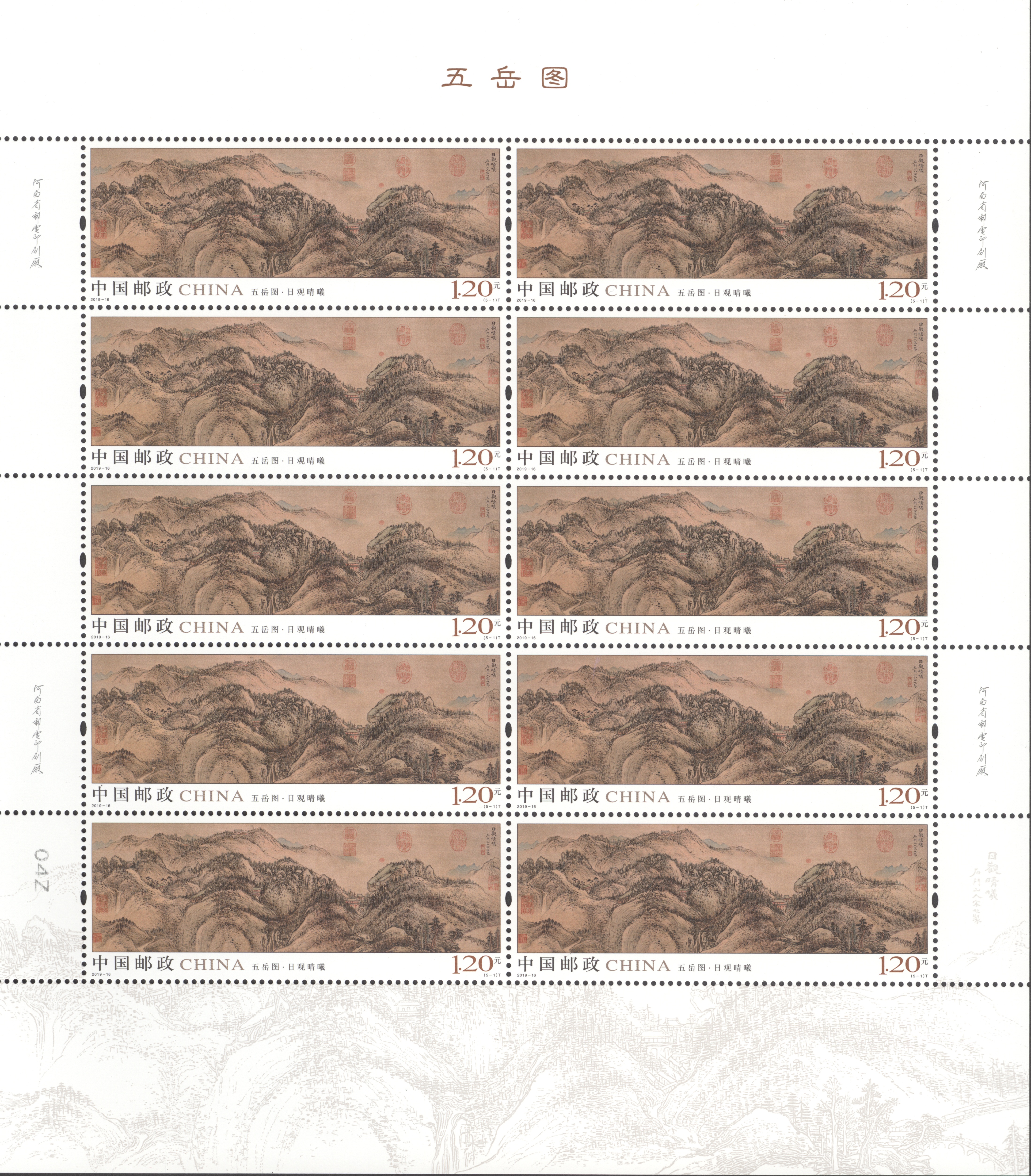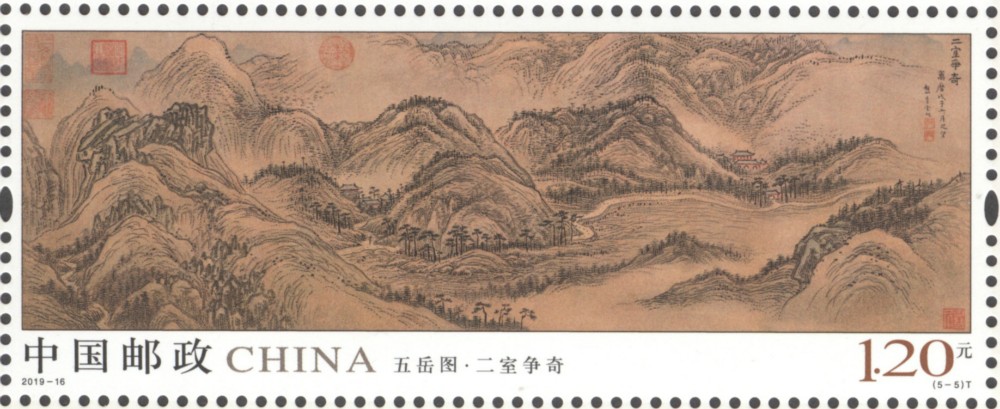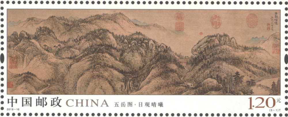 中国邮政定于2019年8月3日发行《五岳图》特种邮票1套5枚,小全张1枚。详情如下: